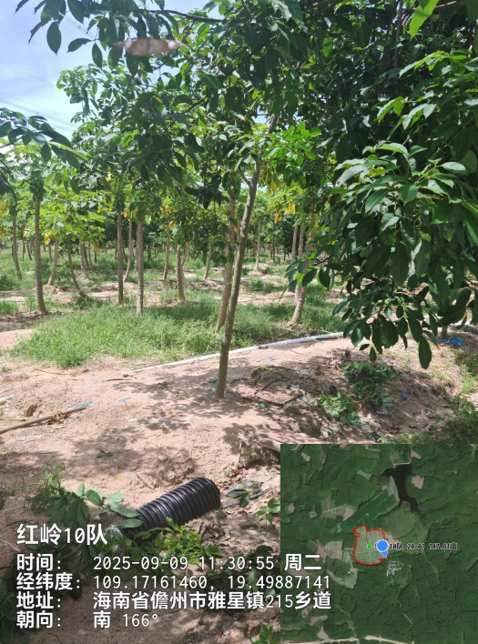 1、该地块于2020年6月完成更新定植,定植橡胶株行距类型为宽间密植(2*4*20M),郁闭度1级的二级林下土地。地貌类型为平原,土壤质地为砂土,坡度为[0°,5],靠近水源,灌溉距离在800米以内,排水条件为需重新开设排水沟渠,基本满足排水需要;临路状况为3.5米水泥硬化道路,2km内有供电设施,通电较便捷。