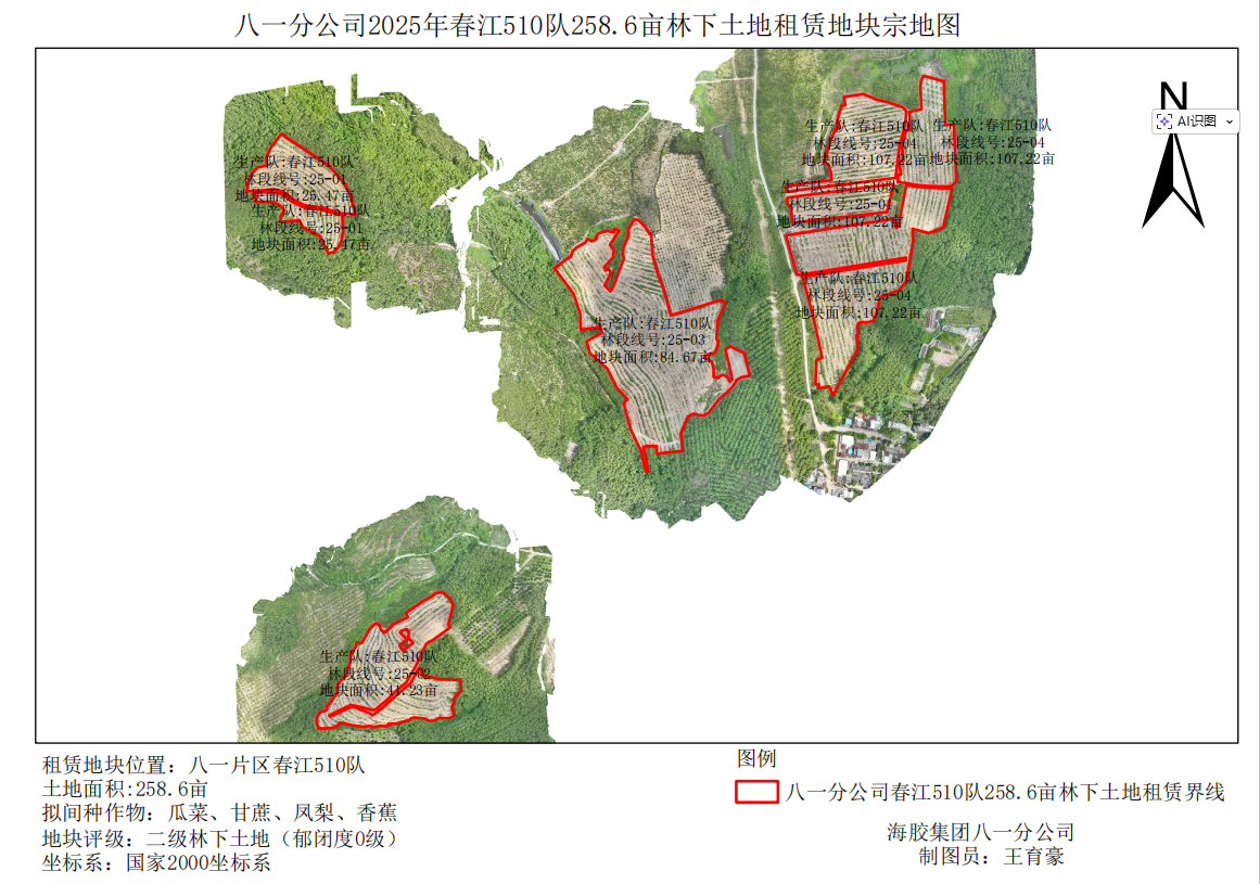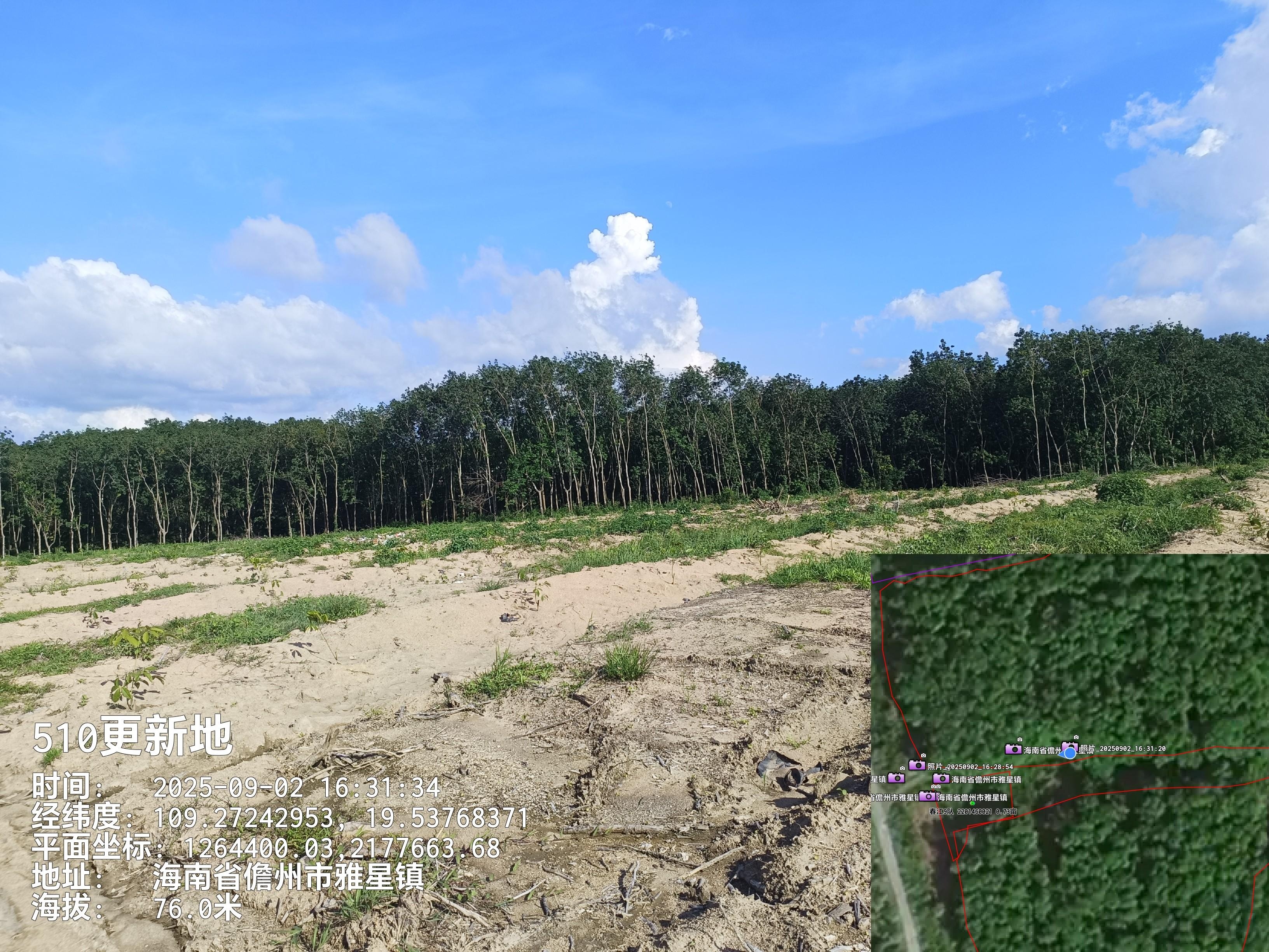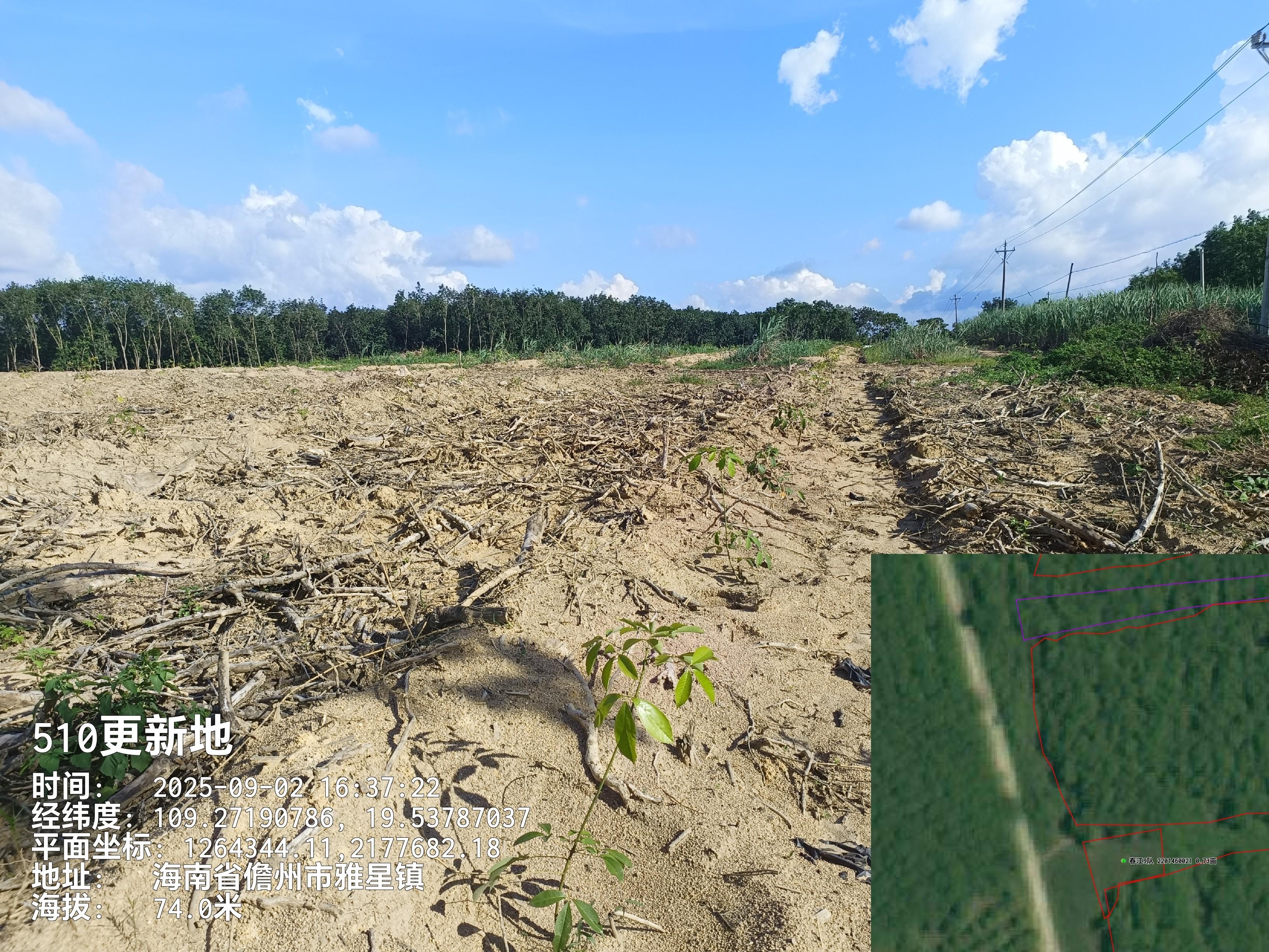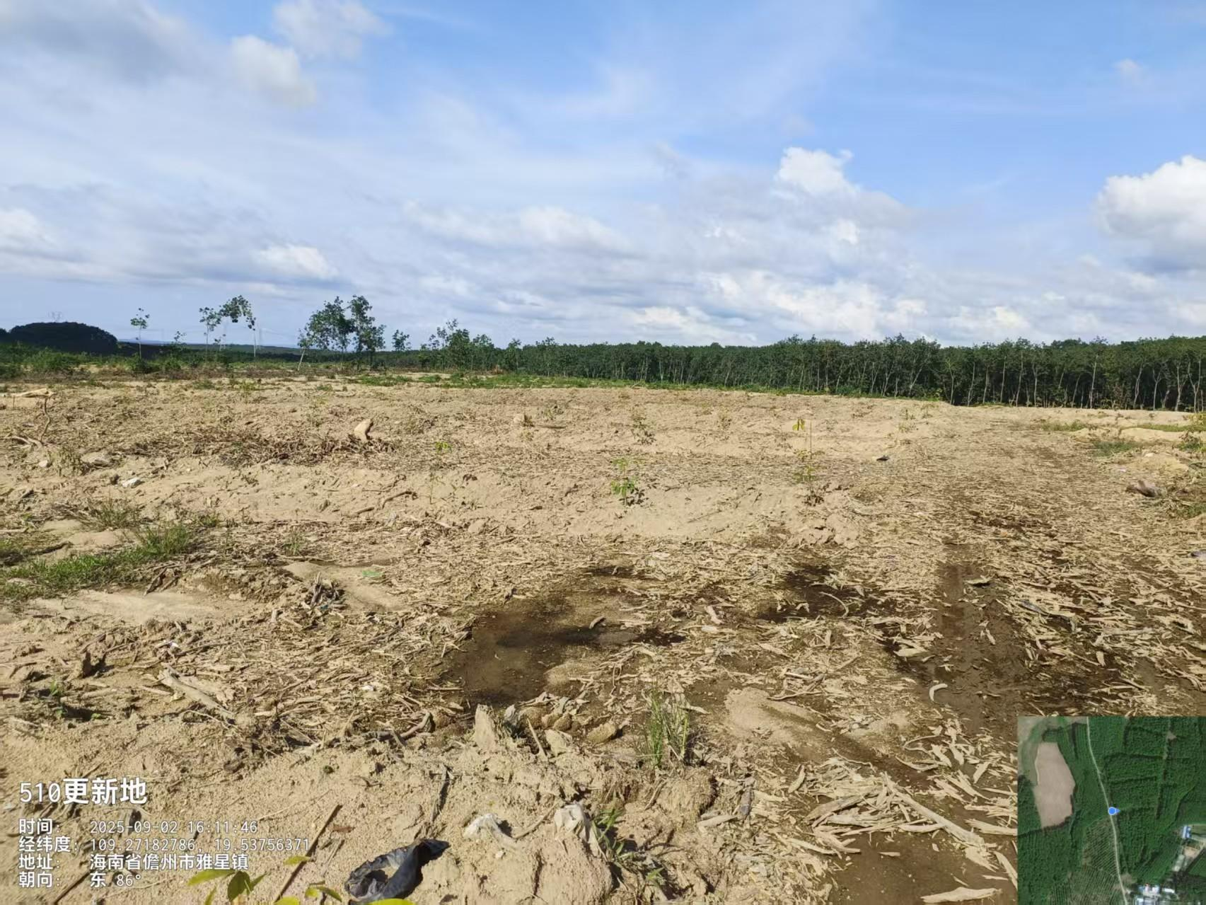 1、该地块于2025年8月完成更新定植,定植橡胶株行距类型为常规密植(7*2.9M),郁闭度0级的二级林下土地。地貌类型为台地,土壤质地为砂土,坡度为[5°,15],不靠近水源,灌溉距离在1800米以上,排水条件为需重新开设排水沟渠,基本满足排水需要;临路状况为3.5米水泥硬化道路,1km内有供电设施,通电便捷。
