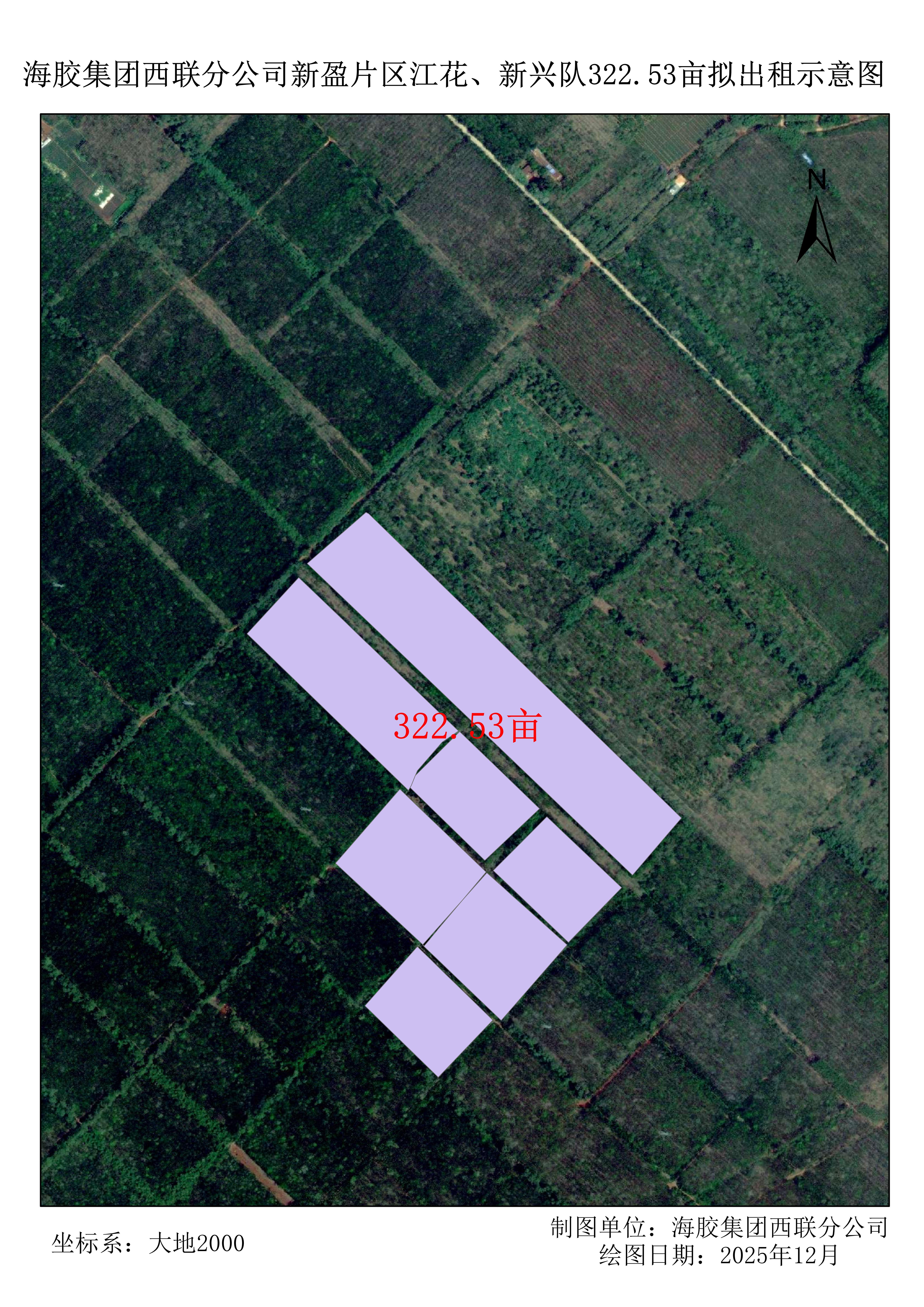 1、该地块于2025年8月完成更新定植322.53亩,定植橡胶株行距类型为窄行(7*3M),郁闭度0级,该地块间种矮杆作物须距离橡胶树头1米以上,高杆作物距离橡胶树头2米以上,间种作物要求严格按照海胶集团《胶园林下土地短期租赁管理办法》及橡胶非胶作物技术规范文件标准执行。